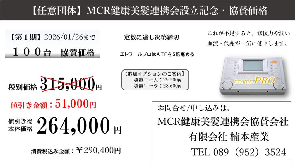 今回の協賛価格は、【任意団体】MCR健康美髪連携会の設立記念として特別に設定されたものです。